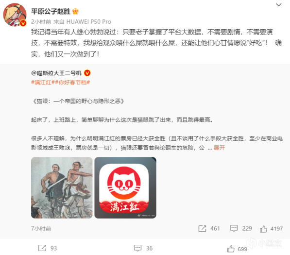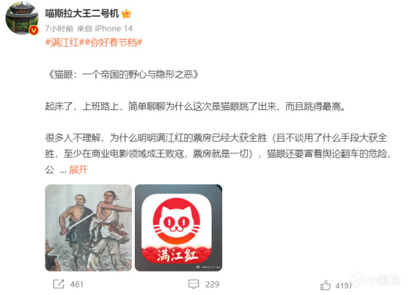 知名軍事博主“喵斯拉大王二號機”則是炮轟《滿江紅》的票房問題,並且直言他們四人是擋了滿江紅投資人包括貓眼等大公司的財路,而且斥責《滿江紅》電影中的暴力傾向。
