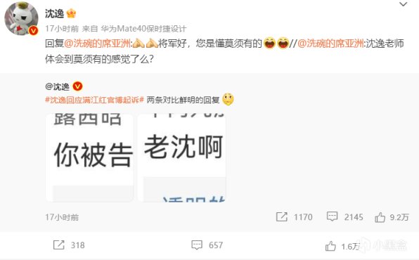 復旦大學知名網紅,國際ZZ系人氣講師、國際ZZ系博士沈逸不卑不亢,表示自己的微博能夠引起片方的重視有些“受寵若驚”。起訴是權利,應訴是法律義務。以事實爲依據,以法律爲準繩。相信片方能夠在庭審環節以嚴謹證據來回應關切說明真相。並附上霸氣的三字:法院見!也有好友調侃沈逸老師是否體會到了莫須有的感覺!