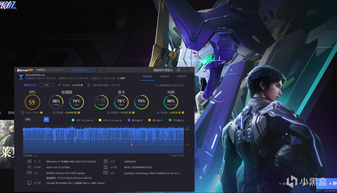这里采用gamepp的测试工具给大家看看情况,博主在3050游戏测试方面也有所涉猎,后续大家感兴趣可以单独给大家看一下视频!我的笔电30504G可以跑平均59帧左右。