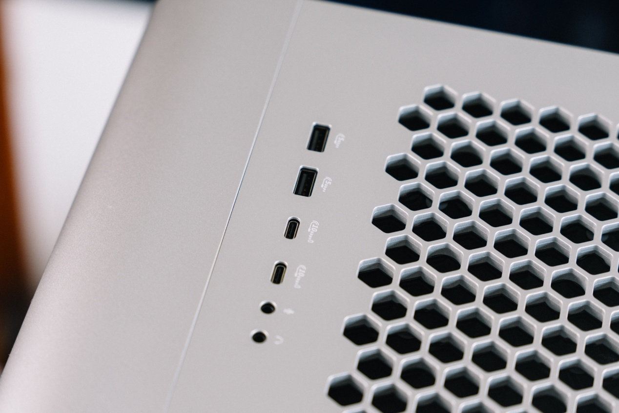 機身的前置面板接口安排在主機的頂端,同樣包括1個音頻輸入,1個音頻輸出,2個USB-A 5Gbps,2個USB-C 10Gbps且支持PhowerShare充電,這樣的設計主要是給主機下置時設計的。
