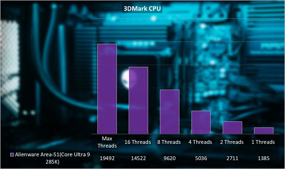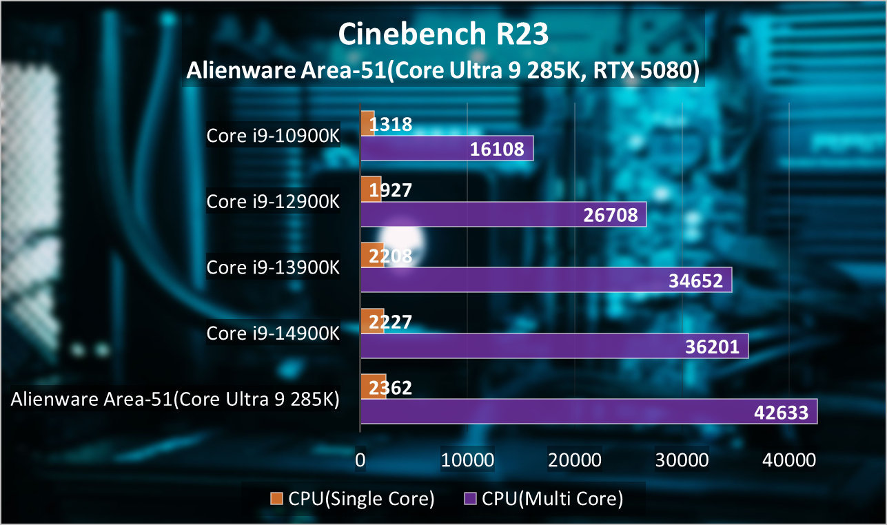 同樣在Cinebench R23中,Area-51的性能釋放足夠讓酷睿Ultra 9 285K有不錯的表現。