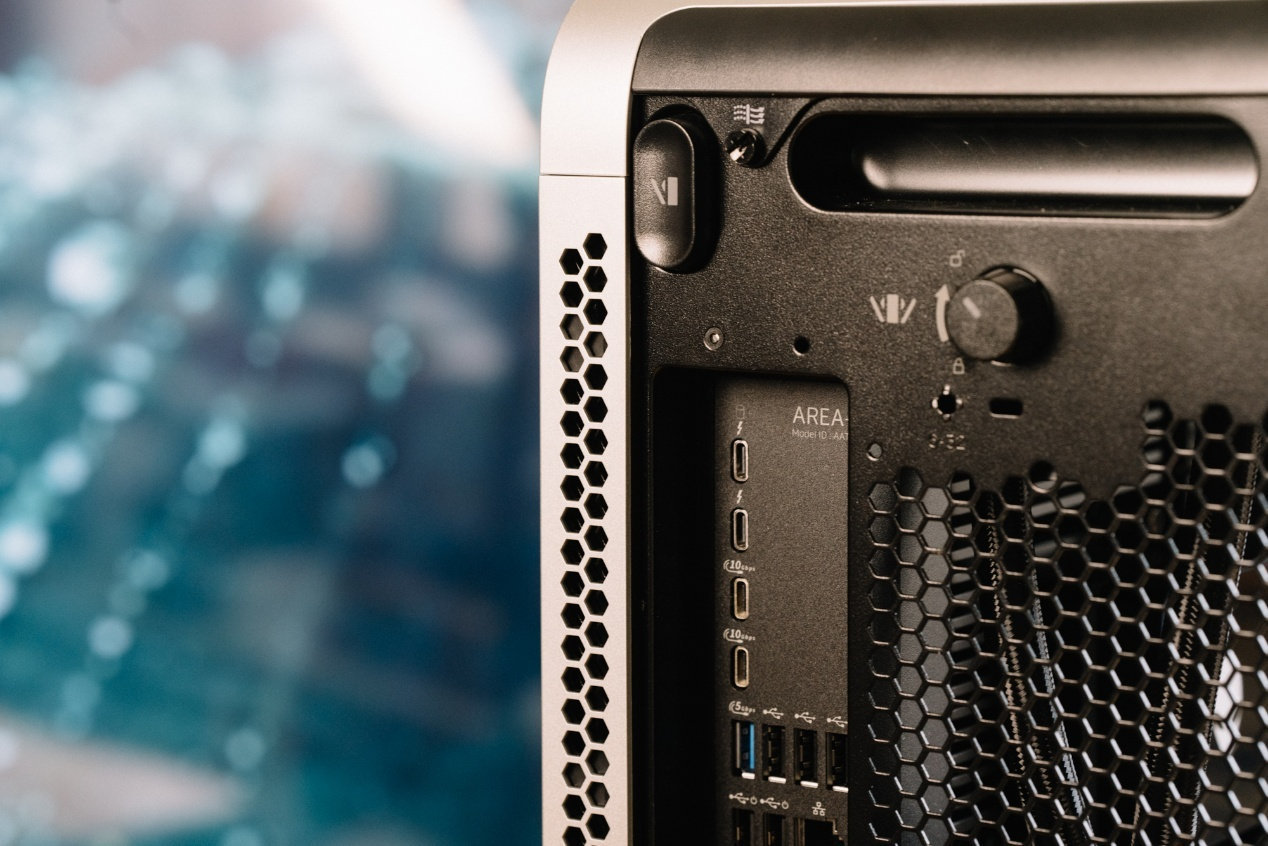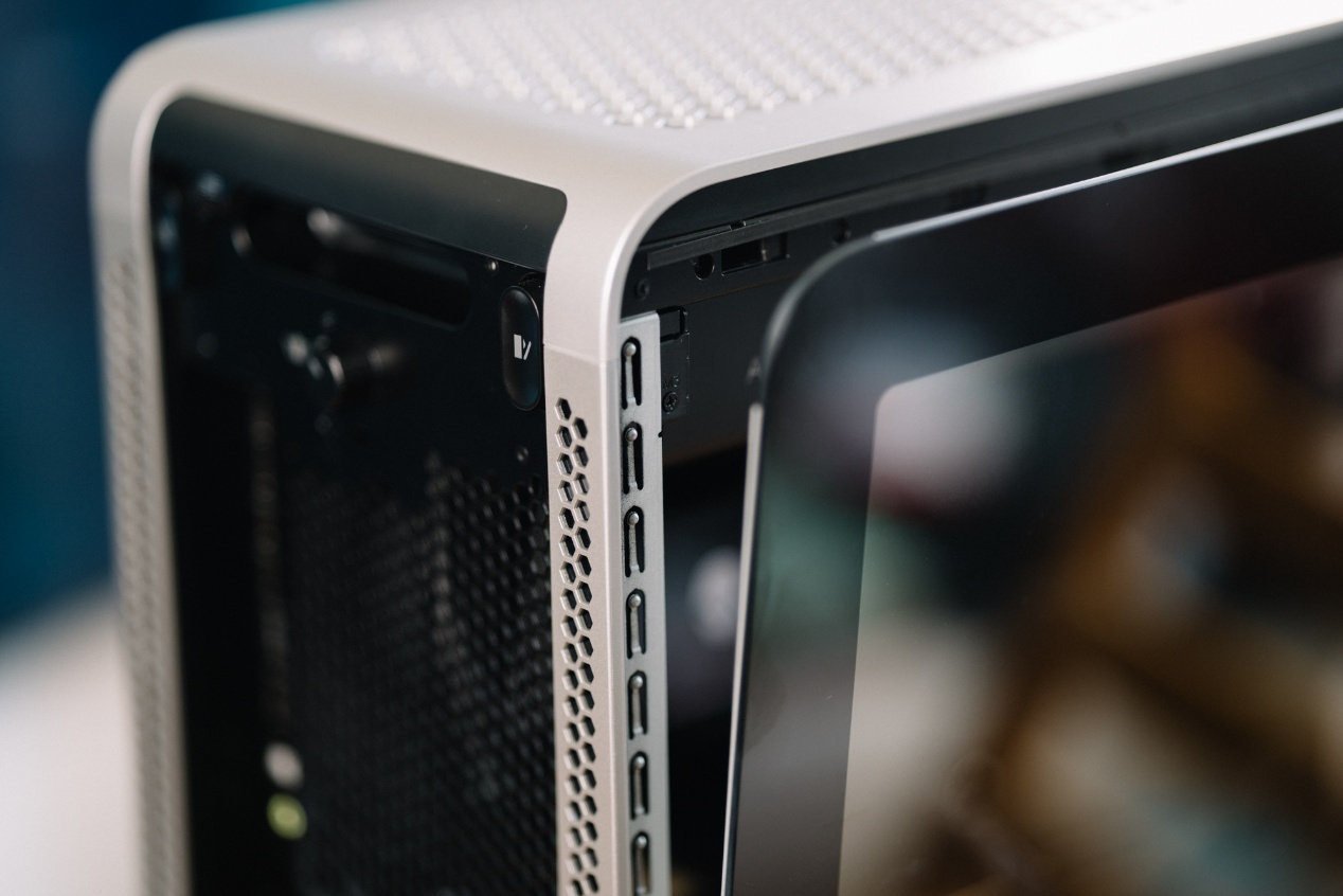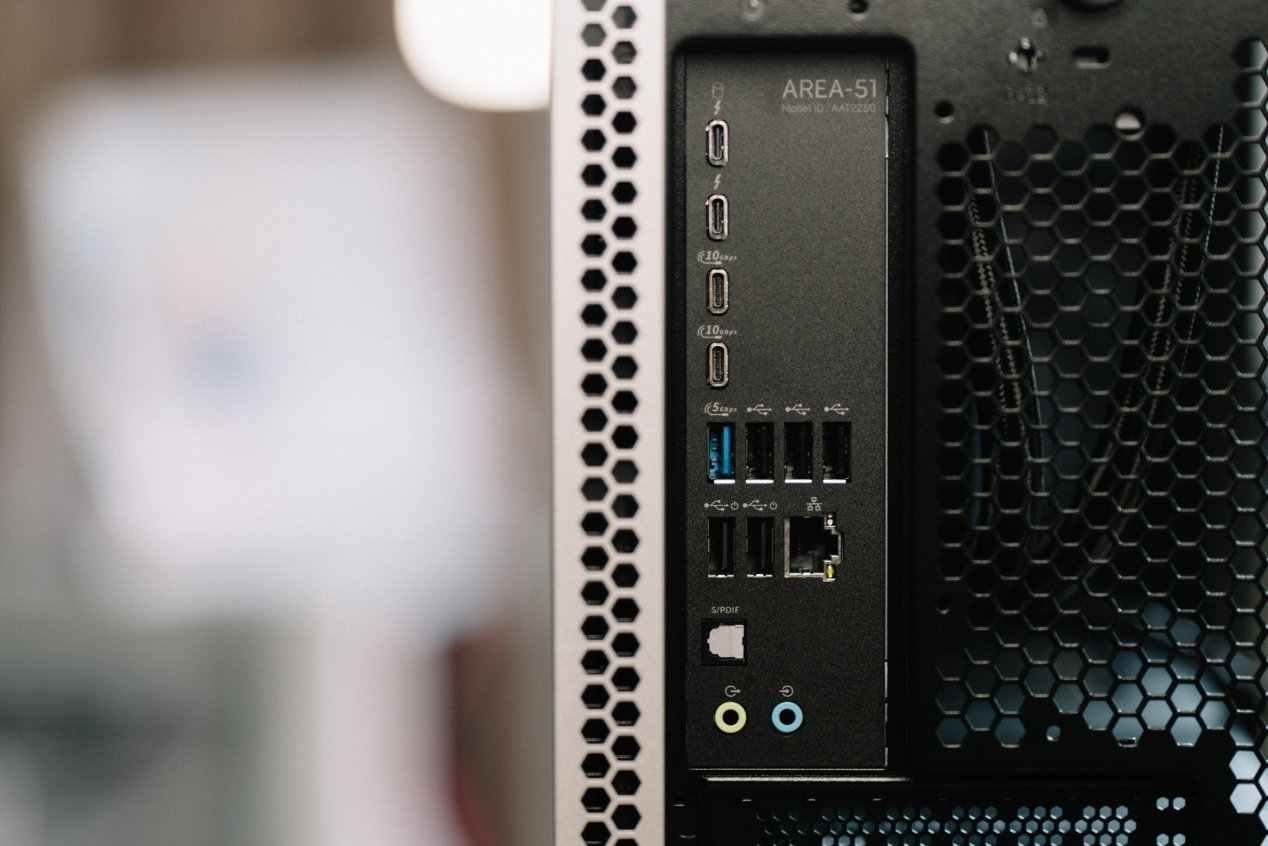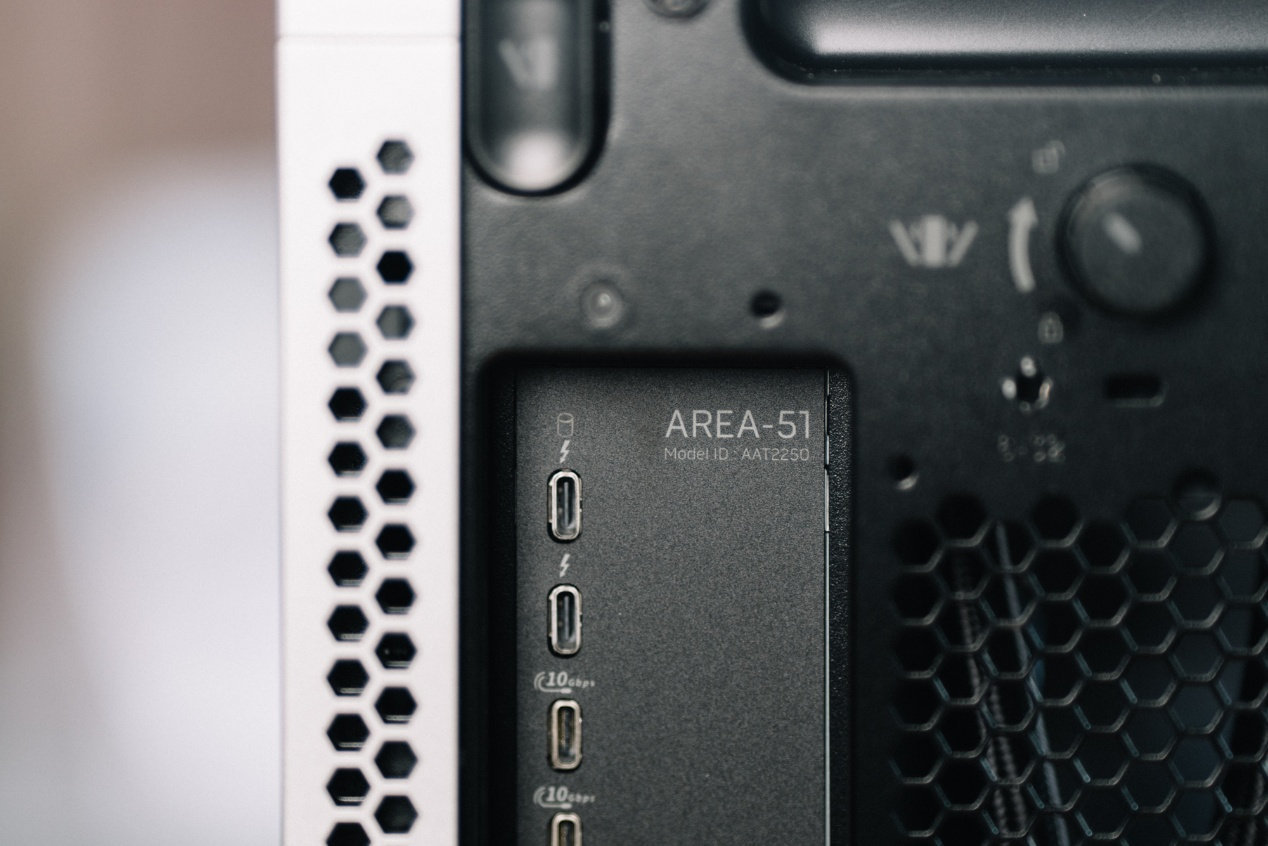 沒有了太多兼容性的顧慮,讓Alienware外星人Area-51臺式機的擴展顯得非常直接。背後的接口面板先一次性給足4個USB-C接口,其中2個爲雷電4,另外2個爲USB 3.2 Type-C 10Gbps。