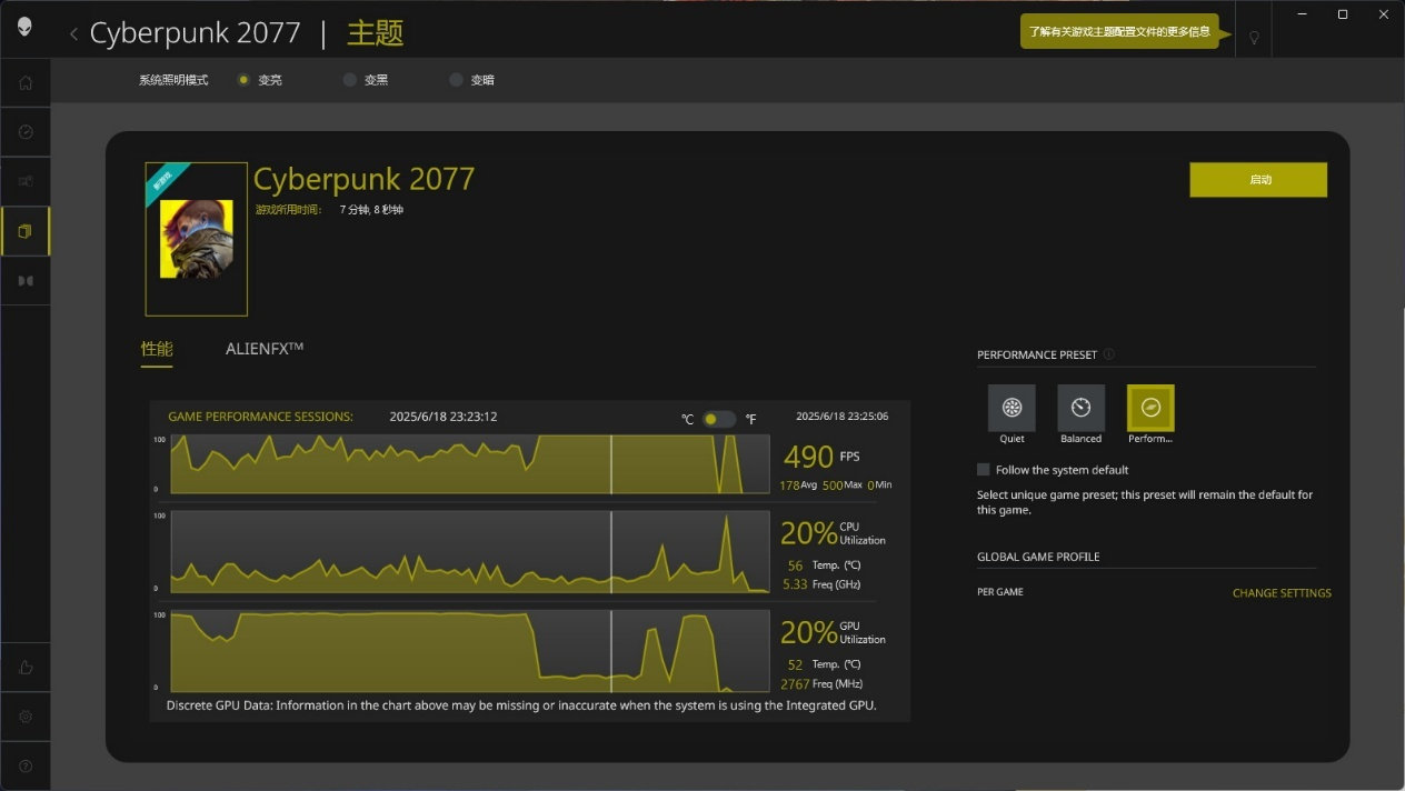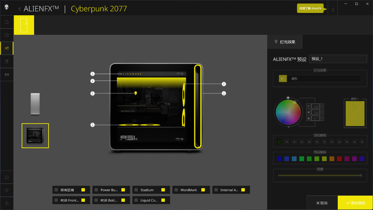 即使玩家不想自行定義,AlienFX也會根據打開的遊戲自動調整。以打開《賽博朋克2077》爲例,燈效就會自動讀取遊戲Logo的顏色,將主題燈效同步調整爲黃色。因此真的建議購買這臺主機的同學,最好還是有足夠的空間將主機放在顯然的地方,不然那同步燈效真的有些浪費了。