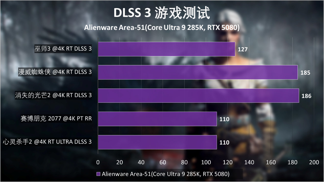 這時候遊戲畫質和流暢度是質的飛躍,在測試《霍格沃茨之遺》、《心靈殺手2》等多款DLSS 4遊戲時候,Area-51可以做到在4K最高畫質和光追效果下200FPS左右。