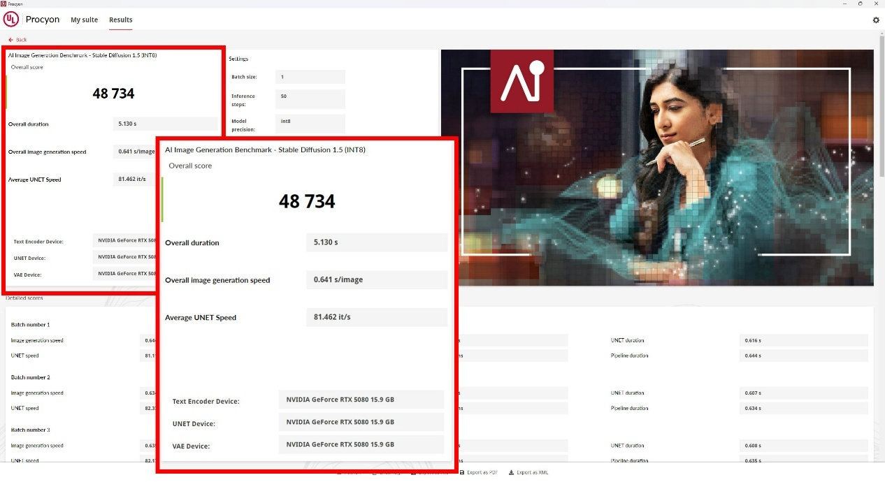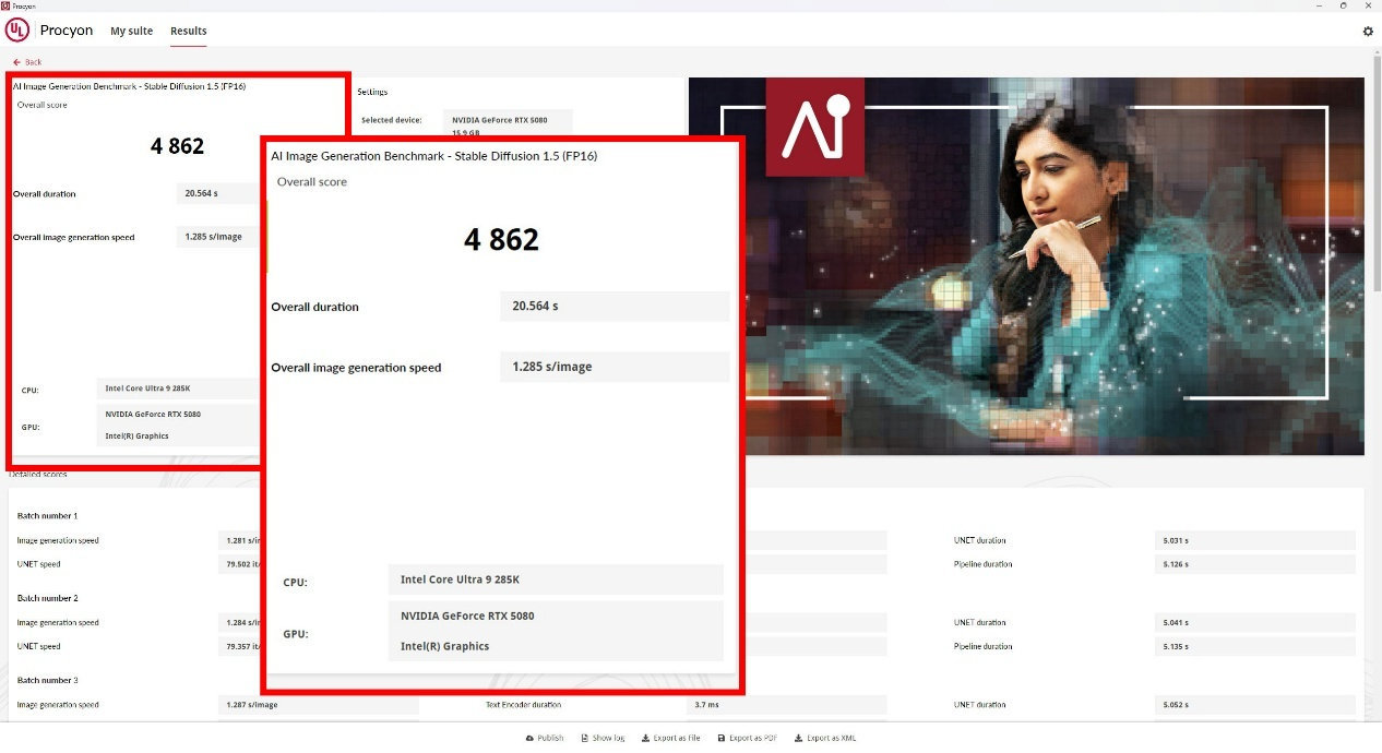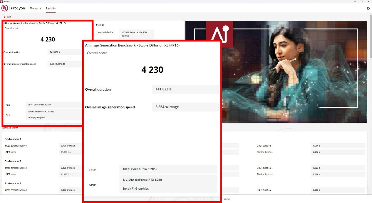 最後是AI與內容創作。本地大模型表現開始成爲判斷臺式機標準。這裏先通過UL Procyon Stable Diffusion 1.5 FP16和INT8,以及Stable Diffusion XL FP16測試,看到Area-51讓GeForce RTX 5080帶來的表現足夠強勁。Stable Diffusion 1.5 INT8生成一張圖像的時間只需要0.641s,Stable Diffusion 1.5 FP16生成一張圖的時間也僅需要1.258s,最爲嚴苛的Stable Diffusion XL FP16僅需要8.8s就能完成。