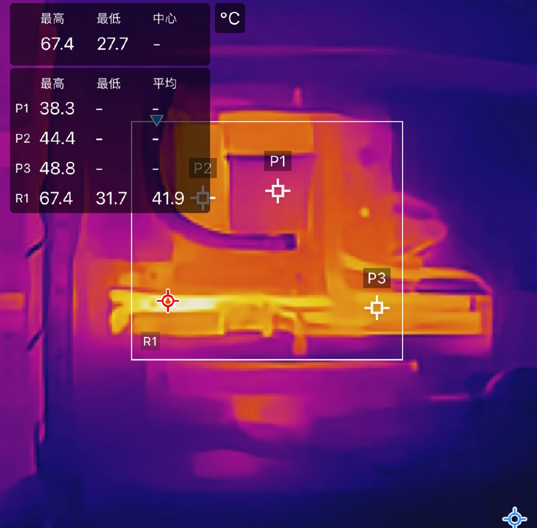 這樣的設計下帶來的效果是明顯的。通過壓力測試下,GeForce RTX 5080作爲機箱內的主要發熱源,散熱鰭片最高溫度僅在67.4℃,而整體機箱內部溫度更低。酷睿Ultra 9 285K由於本身發熱量不大,搭配120mm三風扇一體水冷,自然更無壓力。