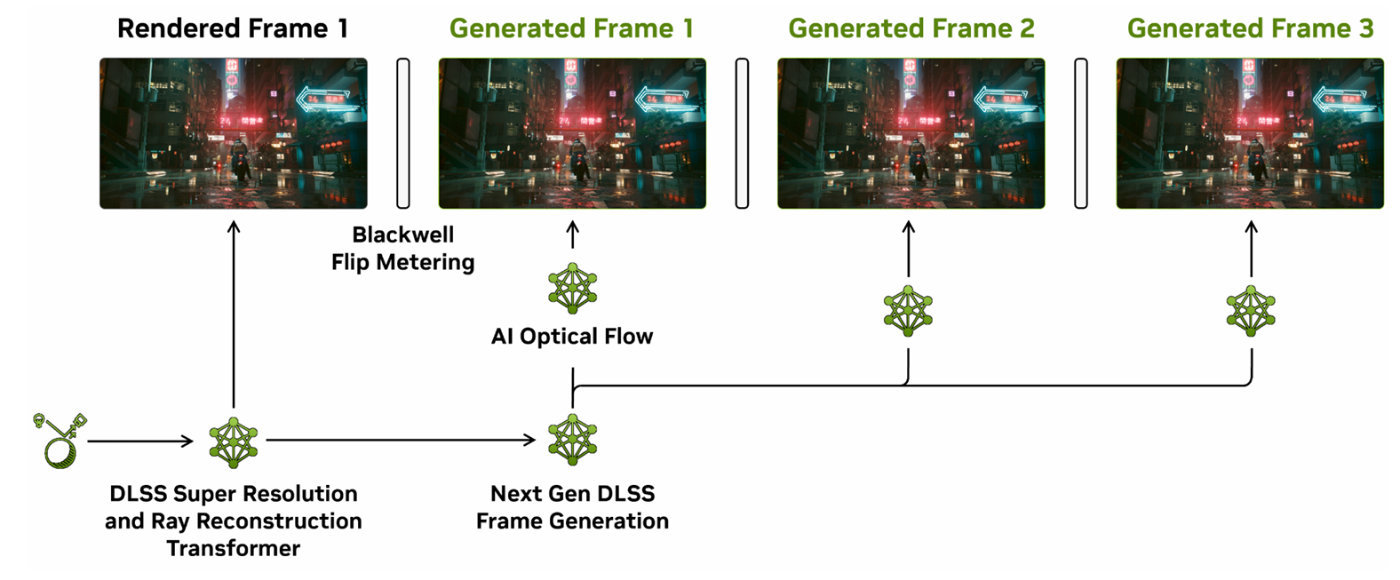 重點還是DLSS 4。DLSS 4是Blackwell提升遊戲體驗的重要技術,DLSS 4可以一步到位通過人工智能提升幀率,降低延遲,改善遊戲畫質。特別是引入了全新的多幀生成技術(Multi Frame Generation,MFG),提供更快的性能和更低的內存使用,並且由CNN卷積神經網絡模型更換到了Transformer模型,超分辨率(Super Resolution,SR),光線重建(Ray Reconstruction,RR),深度學習抗鋸齒(Deep Learning Anti-Aliasing,DLAA)均獲得了新的進展,圖像質量和穩定性有所提升。