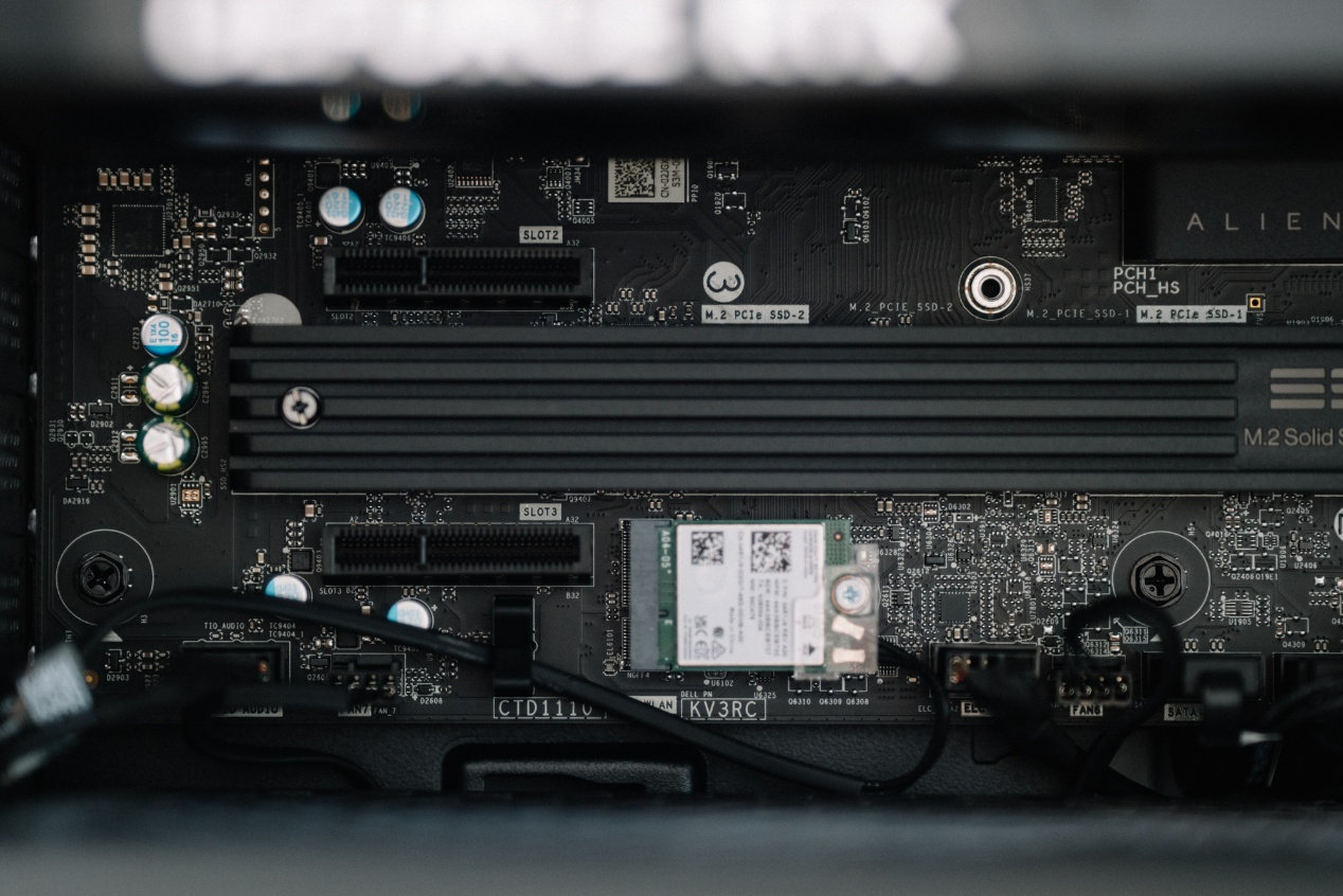 與顯卡連接的Area-51主板使用的是標準的ATX規格,與酷睿Ultra 9 285K搭配的芯片組爲Z890,因此在PCIe擴展上留足了通道,包括提供1個PCIe 5.0 x16的顯卡插槽,1個PCIe 5.0 SSD M.2固態硬盤槽,2個PCIe 4.0 M.2固態硬盤槽。