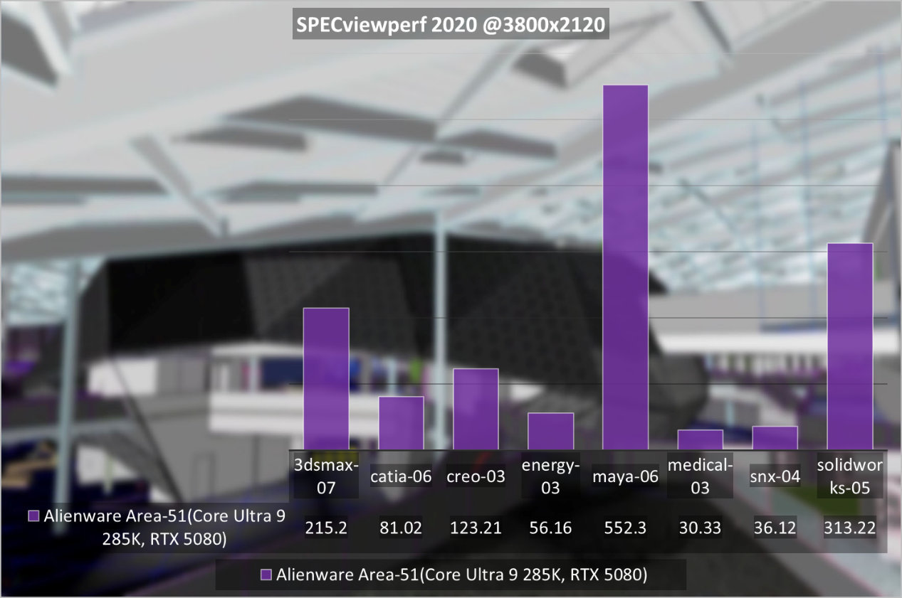 最後我們用SPECviewperf用來考驗OpenGL和Direct X API的3D圖形性能,測試場景包括3dsmax、Catia、Creo、Energy、Maya、Medical、SNX、Solidworks。Area-51雖然用的不是專業顯卡,在表現上其實已經滿足專業工作站的使用場景了。