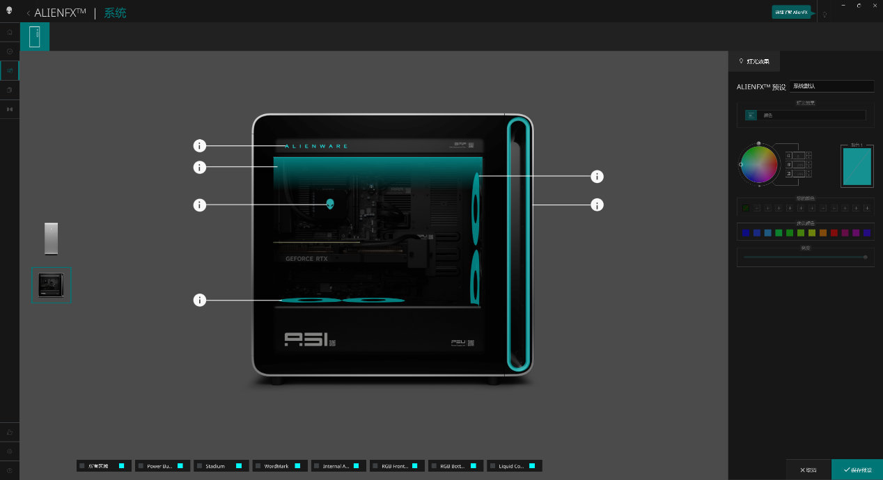 默認的幽蘭並非這款臺式機唯一顏色,通過Alienware Command Center中的AlienFX燈效,可以對軟件界面進行定製化。