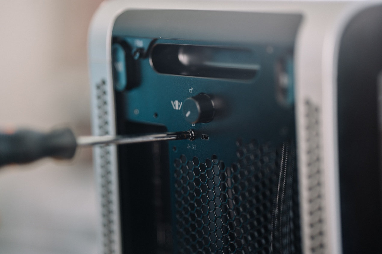 既然購買了臺式機,DIY註定要成爲Alienware外星人Area-51臺式機的另一個玩法。相對於常見的DIY主機,Alienware外星人Area-51臺式機拆裝細節是拉滿的,無論拆下鋼化玻璃側,還是背板側,都僅需要擰下中間的鎖釦螺絲,然後將旋鈕轉動到解鎖位置。