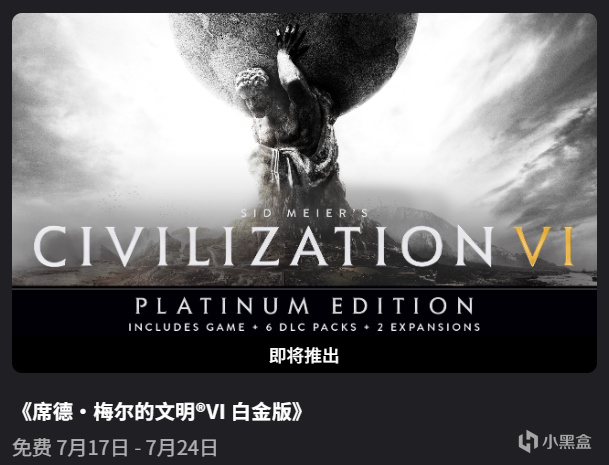 下一週贈送的免費遊戲爲《席德·梅爾的文明®VI 白金版》,領取時間7月17日~7月24日