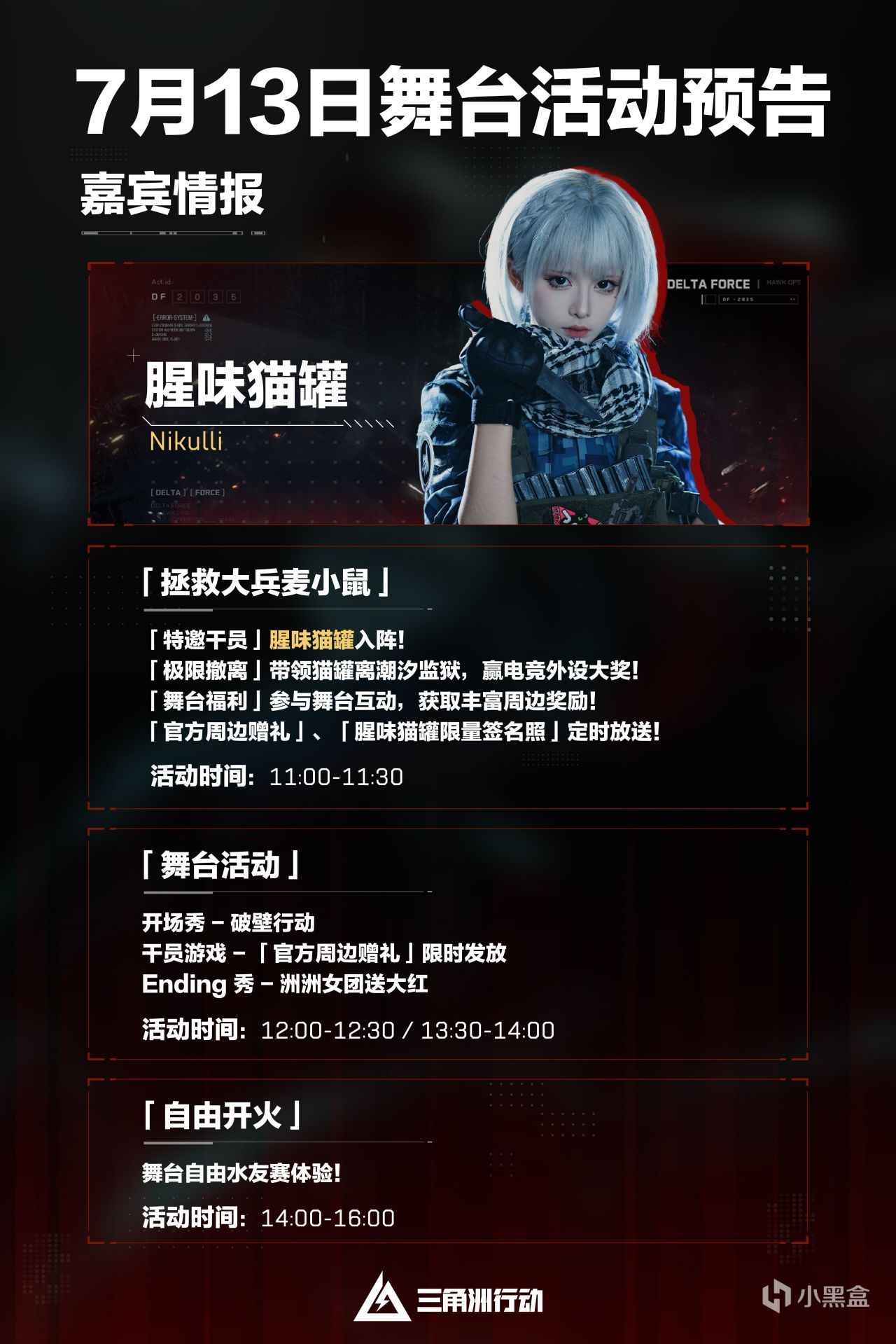 7月13日11点,腥味猫罐发来合作邀请。带领猫罐逃离潮汐监狱,即可参与电竞外设限定抽奖!同时参与舞台互动,有机会得官方周边赠礼、腥味猫罐限量签名照!14点后还将进行舞台自由水友赛体验,欢迎各位干员前来参与!