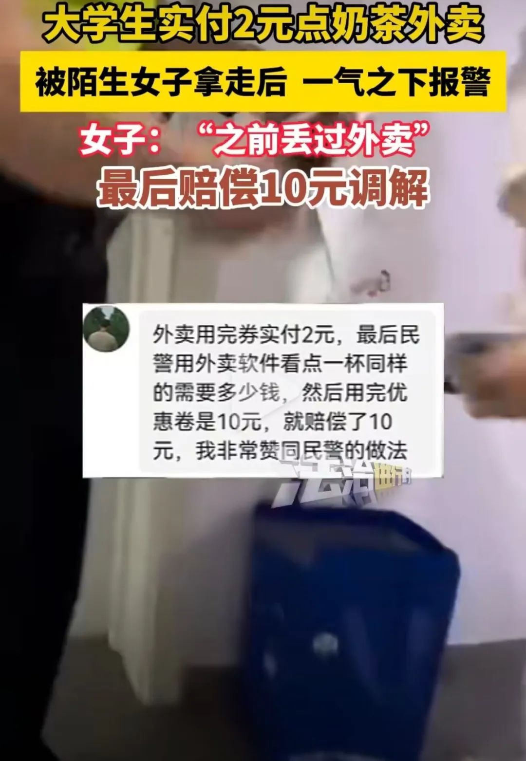 近日,一大学生实付两元点奶茶外卖被陌生女子拿走后,一气之下报警。