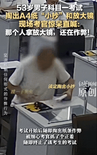 7月3日上午,四川盐亭车管所科目一考场内,一名考生拿出自己准备的“小抄”和放大镜作弊,被考官抓了个正着。
