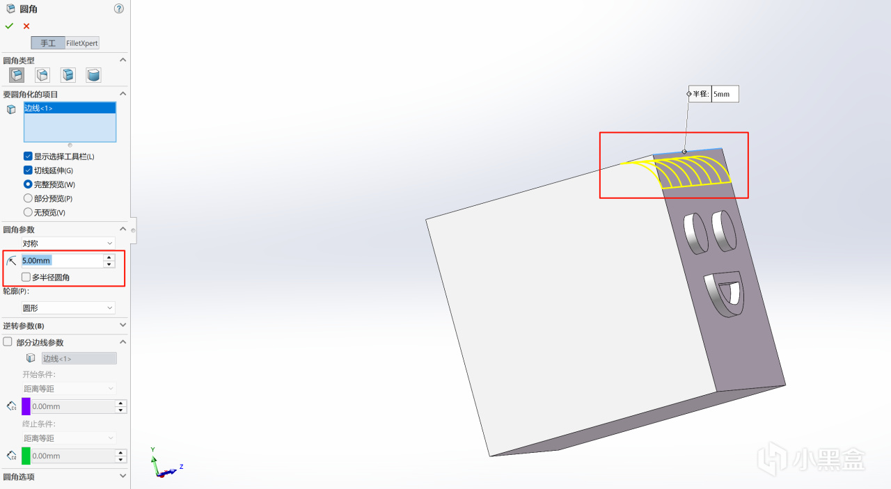 点击圆角功能,然后选中需要做圆角的边