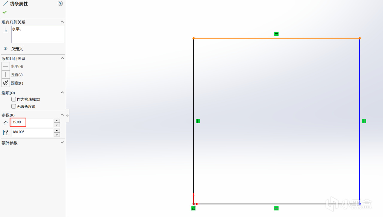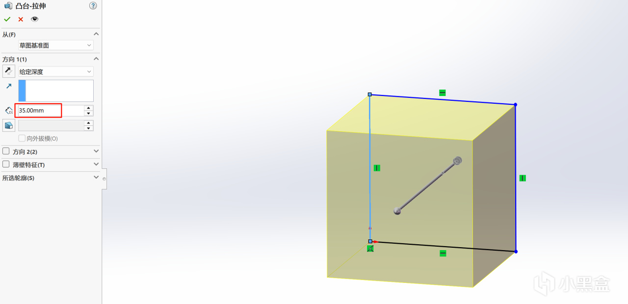 在草图中绘制一个正方形,在左边的参数部分输入你想要的长度,这决定了立方体的大小
