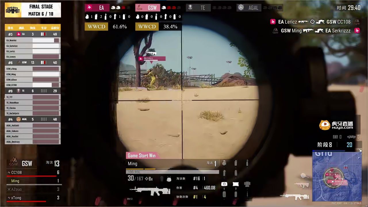 GSW戰隊最後和EA戰隊打決賽圈,最後的時候EA戰隊還把擊倒的最後一人拉起來了,最後的話也是EA戰隊5個淘汰,成功喫雞!