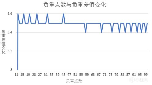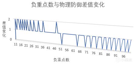 從折線圖來看,當負重點數≤37點,物理防禦差值變化在1~2間反覆徘徊;當負重點數達到48點時,物理防禦差值最後一次達到2;當負重點數>48點,物理防禦差值則在0~1間徘徊。
