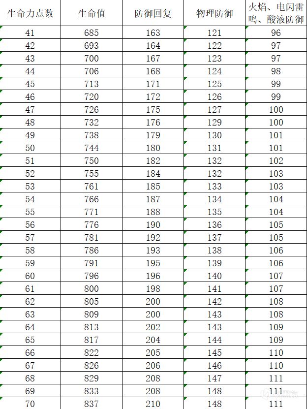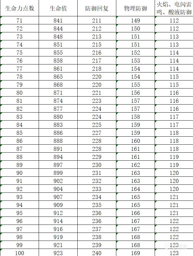 生命力的加點與生命值、防禦回覆、物理防禦以及火焰、電閃雷鳴、酸液的屬性防禦息息相關;以下便是生命力從11~100點時各相關屬性的詳細變化表格。