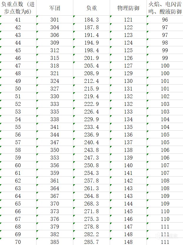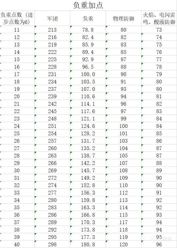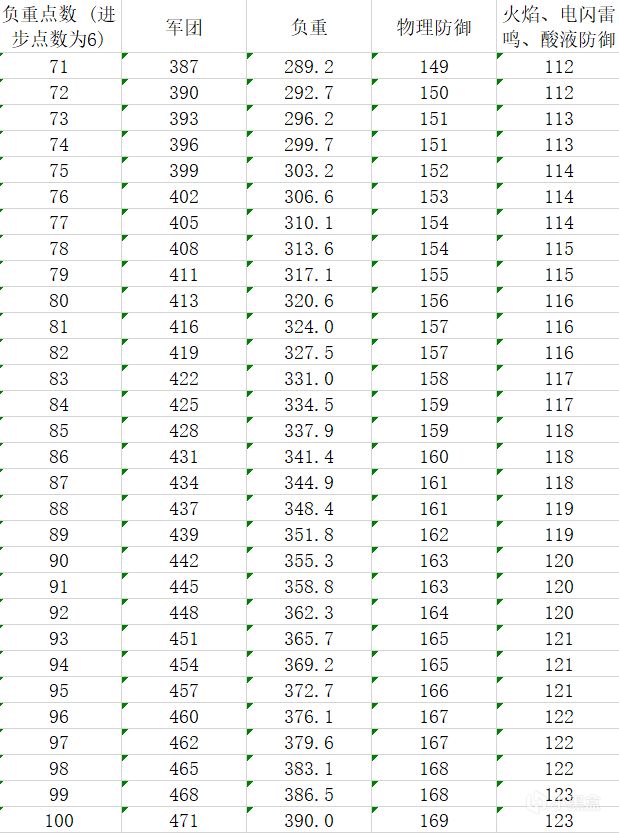 負重的加點與軍團、負重、物理防禦和火焰、電閃雷鳴、酸液的屬性防禦息息相關;以下便是負重從11~100點時各相關屬性的詳細變化表格。