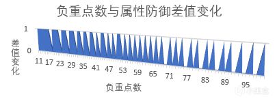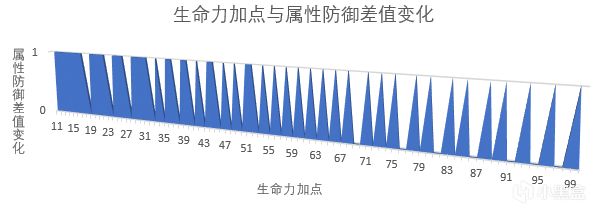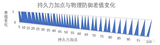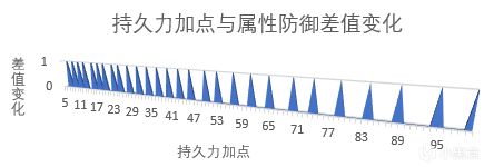 這裏的屬性防禦差值變化頻率相較物理防禦則更加緊縮,在持久力>13點後,差值變化的頻率則趨向於0;但綜合考慮精力與物理防禦的變化,這裏還是同以上兩類。。