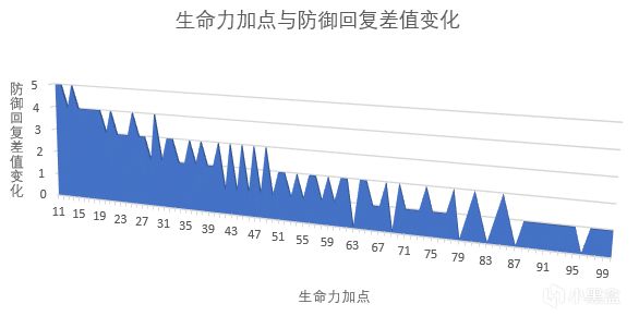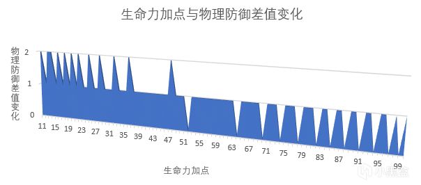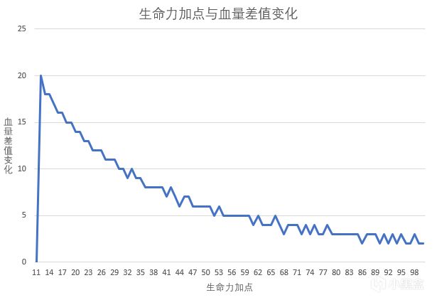 隨着生命力越高,血量上的差值則變得越來越小,下列的“生命力加點與血量差值變化”曲線便印證了這一點。