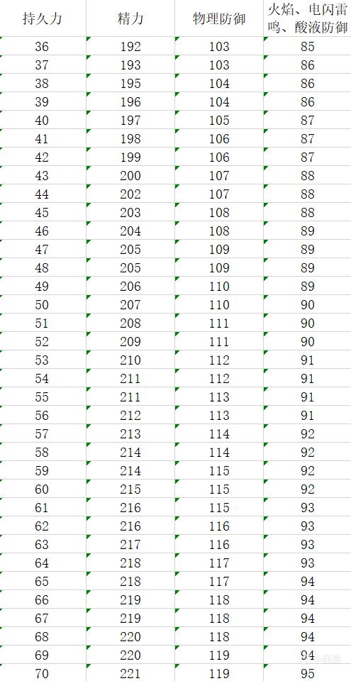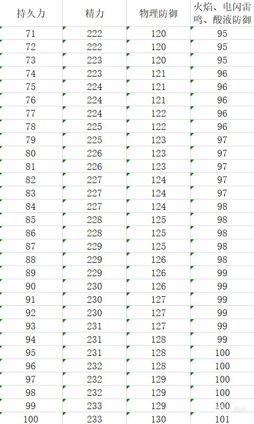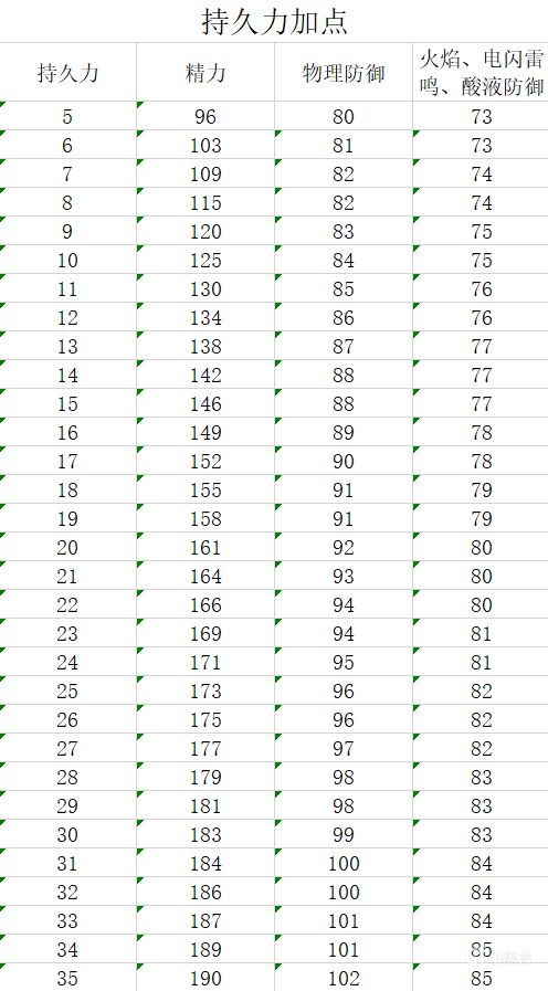 持久力的加點與精力、物理防禦和火焰、電閃雷鳴、酸液的屬性防禦息息相關;以下便是持久力從5~100點時各相關屬性的詳細變化表格。