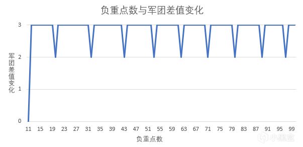 再來看負重點數與軍團差值變化折線圖,發現軍團差值的變化一直在2、3之間反覆徘徊。