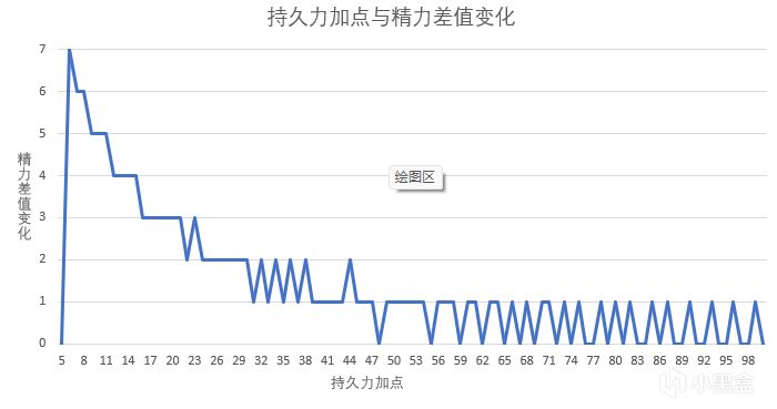 持久力加點與精力的差值變化呈下降趨勢,持久力在5點到6點時變化最大;