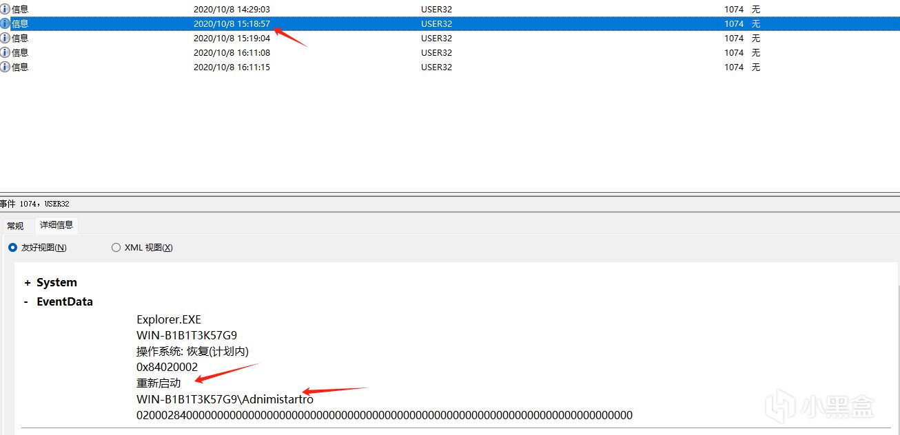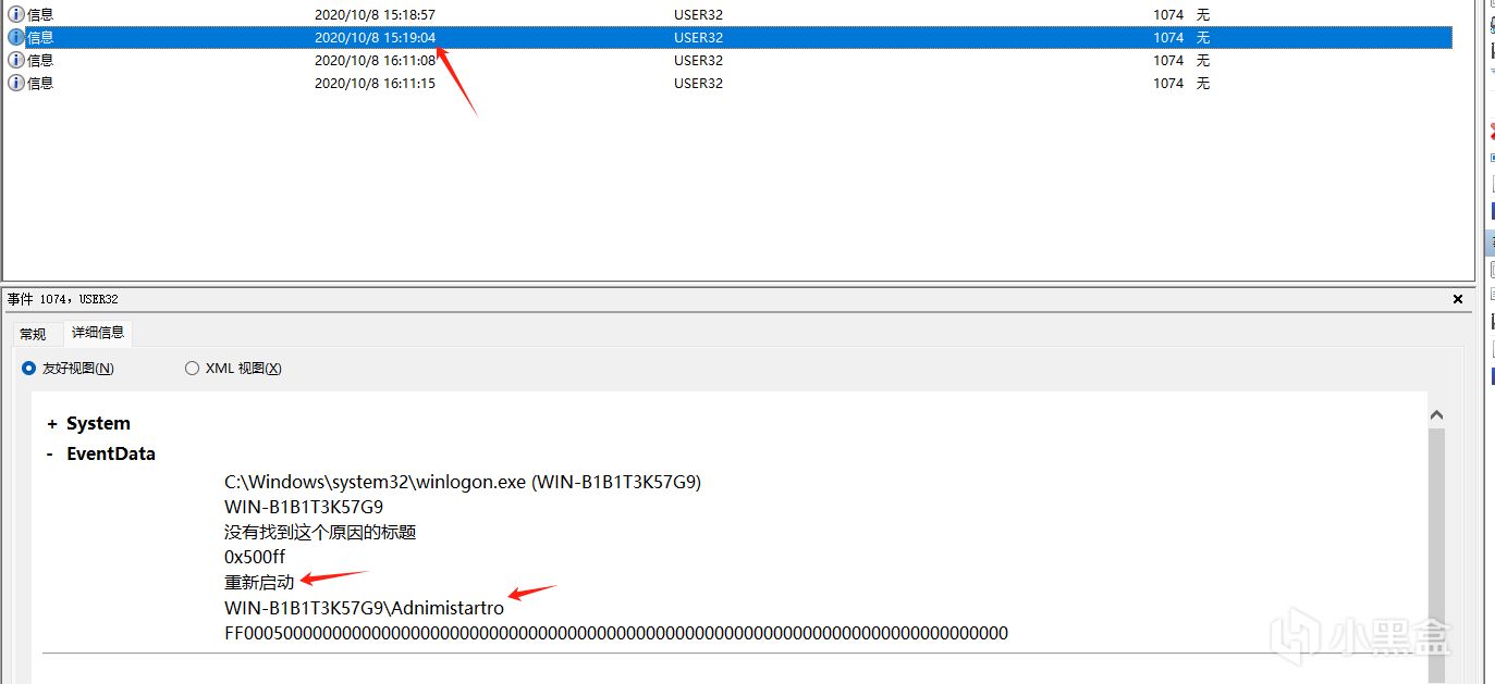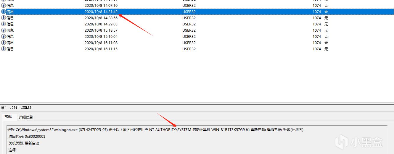 先排查系统日志的1074事件,因为它明确记录 “由用户或程序发起的系统关闭 / 重启”,可以区分是人为的重启还是系统重启