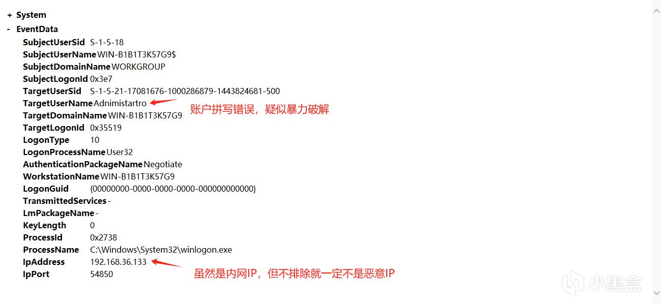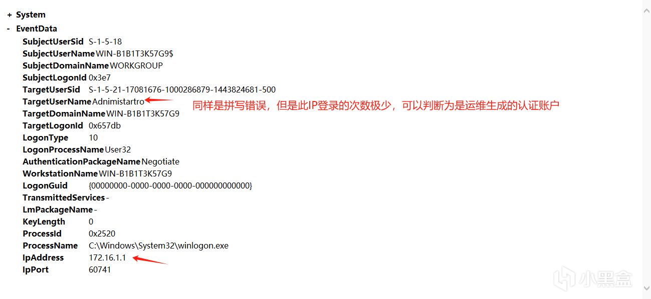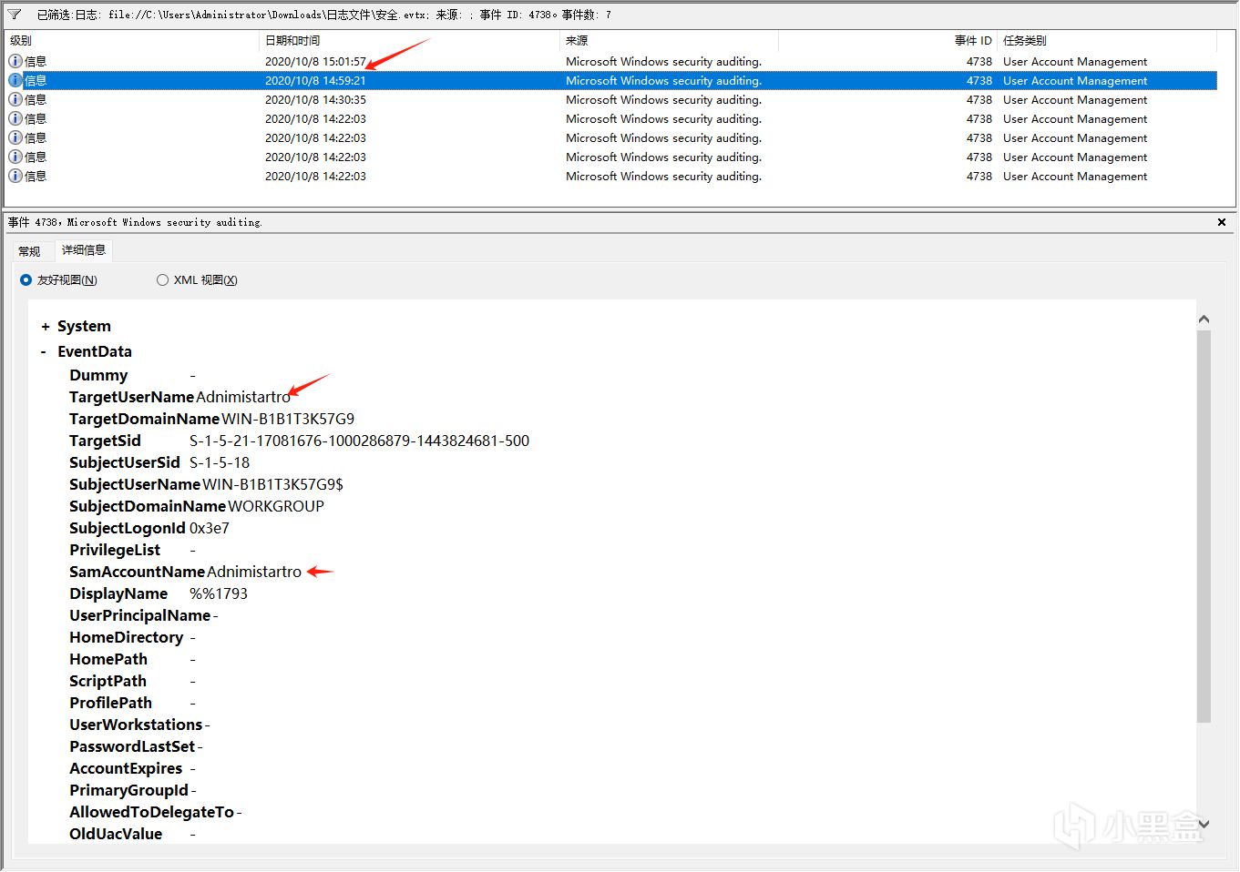 发现拼写错误的administartro,极具可疑性;通过分析其他事件数,可疑断定为此就是黑客修改的用户名
