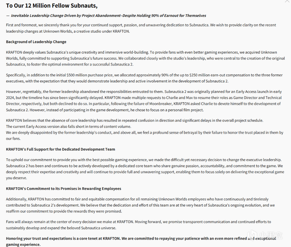 4.眼看事件愈演愈烈,Krafton發佈了一篇公告回應,文中首先否認延遲爲規避獎金支付,稱系基於玩家測試反饋需優化內容。指出收購時除5億美元基礎費用,額外約定2.5億美元獎金中的90%分配給三位創始人,條件是其主導《深海迷航2》開發,多次要求Charlie 和 Max 分別重新擔任遊戲總監和技術總監的職務,但兩人均予以拒絕。Krafton 認爲,核心領導層的缺席導致了項目方向反覆混亂以及整體進度嚴重延誤,當前的搶先體驗版在內容體量上也未能達到預期。Krafton稱已履行獎金分配承諾,但創始人未盡責,構成“對玩家信任的背叛”