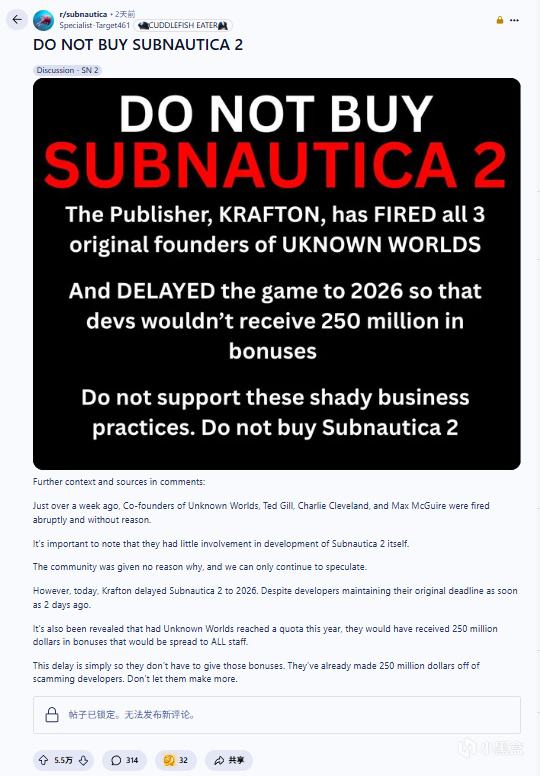 3.Krafton推遲了備受期待的遊戲《深海迷航2》的發佈,這一計劃直接將節奏持續升級,根據彭博社審閱的收購協議,如果2025年前UnknownWorlds能達到某種收益目標,全體員工將會獲得2.5億美元的獎金,而此番延期是Krafton爲了規避這筆分紅。遊戲社區呼籲抵制發行商的"不當行爲" 其中一篇帖子熱度高漲“DO NOT BUY SUBNAUTICA 2"