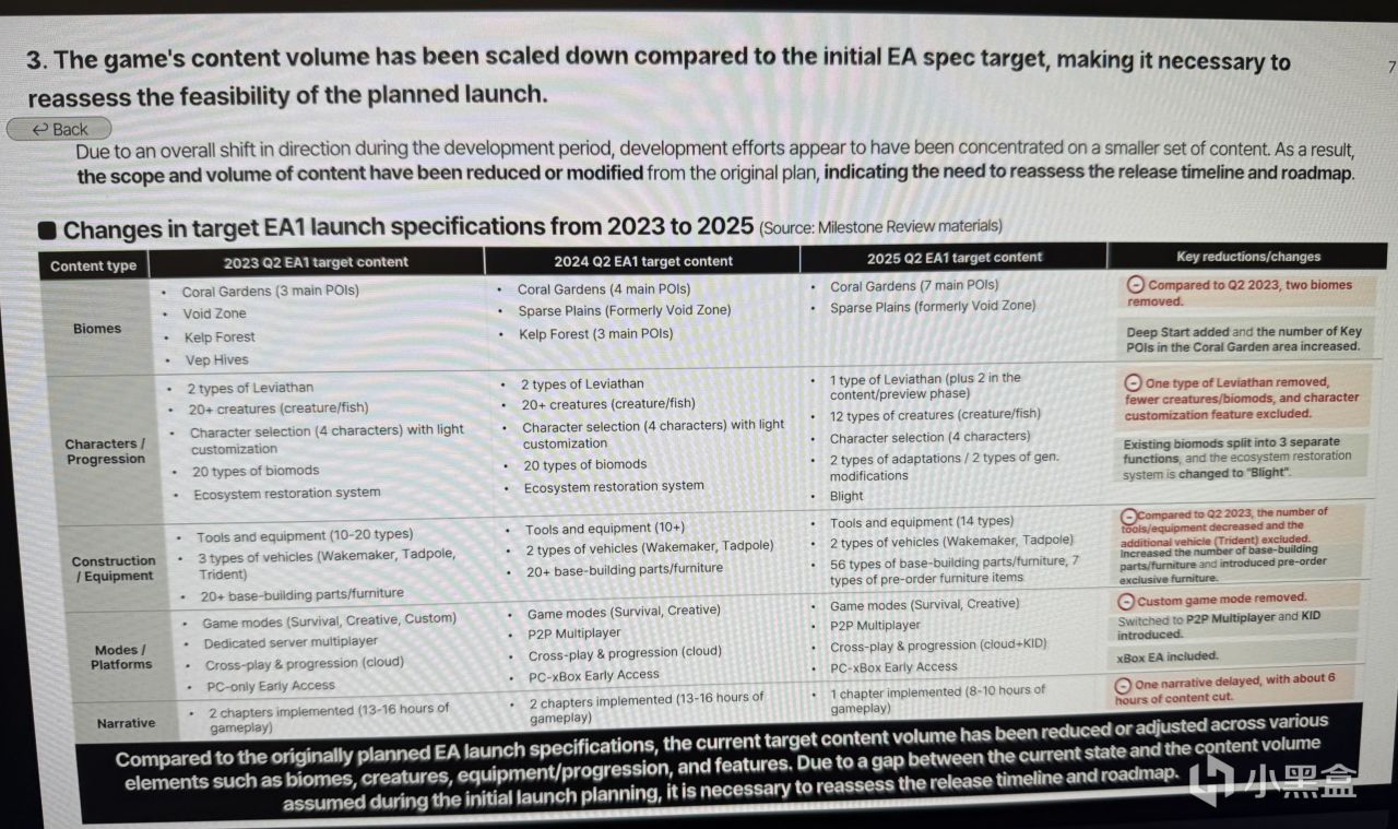 3. 與早期測試(EA)初始規格目標相比,遊戲內容體量已縮減,需重新評估計劃發佈的可行性。