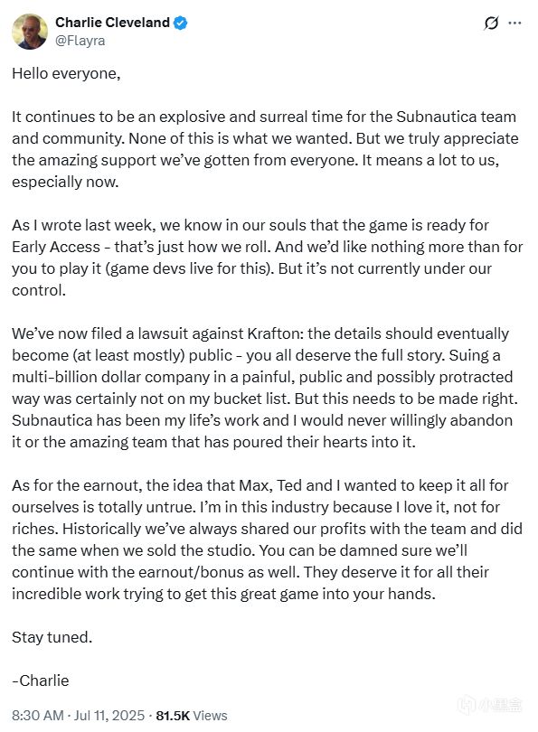 5.隨即Charlie在社交平臺上作出回應,《深海迷航》已經做好了EA發佈的準備,開發團隊也支持此說法,延遲是Krafton單方面決定,非質量問題。文中也否定了他與Ted,Max獨吞獎金的說法,投身這個行業爲了熱愛並非財富,深海迷航系列是他們畢生的心血,絕不會放棄它,也不會放棄那些爲之傾注心血的傑出團隊。他們已經對Krafton提起訴訟,相關細節將在之後公佈,真相可能隨之浮出水面。