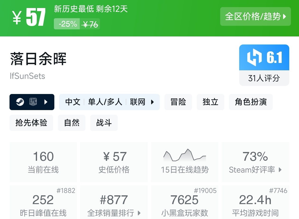大家好,没错,又是我,你们的老朋友亦然,最近,夏促虽然已经结束,但仍然有不少新史低游戏,而且还正因为夏促结束,这些还在新史低的游戏就很稀有,其实新史低的游戏买起来最有安全感,因为很长一段时间都不会更低,我将为各位进行一个汇总,希望我的汇总,能够帮助各位盒友挑选心仪的游戏。