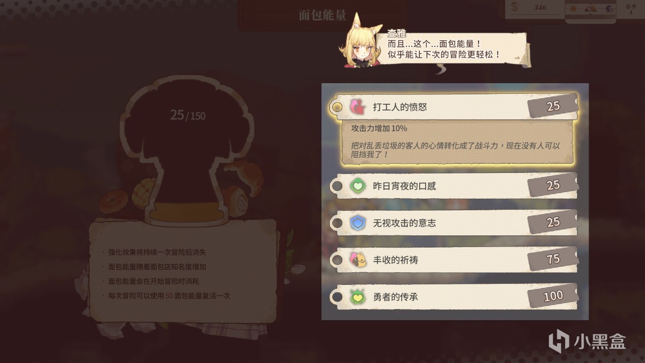 每次出門還能在麪包祭壇處使用“麪包能量”強化自身,增加的這些被動對戰鬥冒險相當重要。而“麪包能量”會因店鋪的知名度增加而增加,且每次強化只在一次冒險中有效,算是爲森林打怪拿材料和經營店鋪賣麪包這個循環增加了多一層羈絆了!