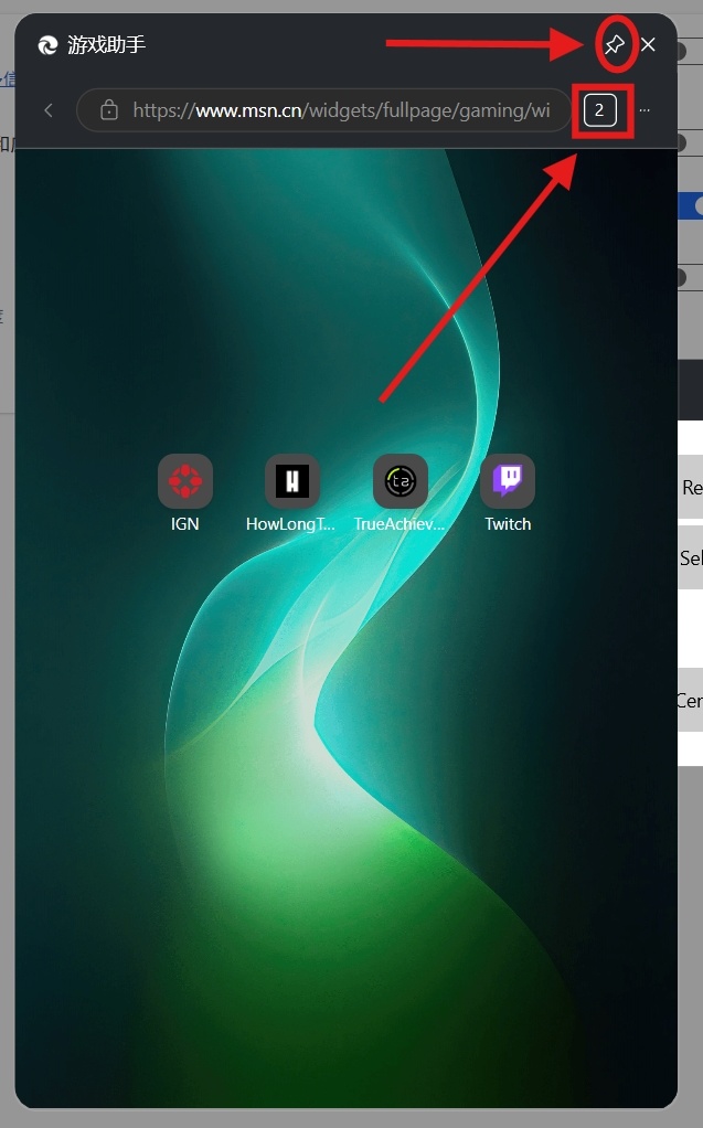 紅框標註的就是遊戲助手,點開可以查看它現在已經產生了多少標籤頁,關閉那些標籤頁,讓右上角的圖釘標誌處於如圖狀態,最後關閉“遊戲助手”界面