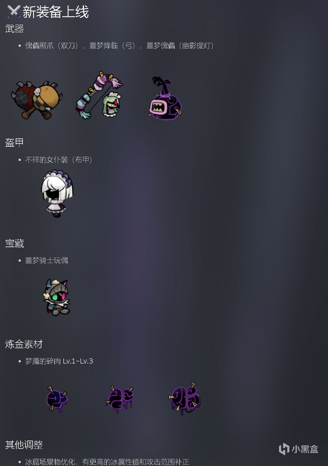 新更新,怎么能少得了新装备?三种噩梦系武器,一套女仆装,新宝藏等内容,都等着你来发掘!