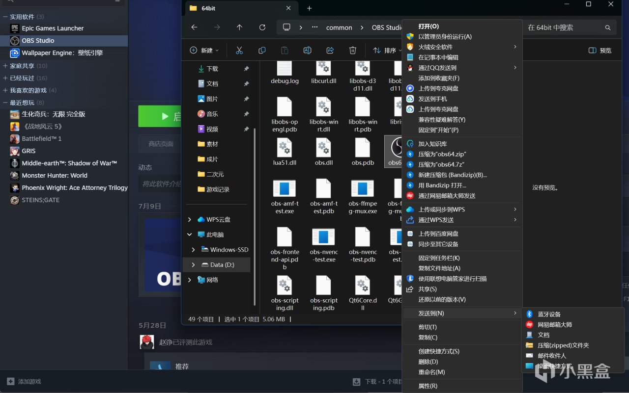 OBS Studio:非常好用的录屏软件,记录自己的游戏日常,还可以用来直播,只不过需要推流,Steam平台免费下载,平时启动可能需要启动steam,想不启动steam桌面直接进入的方法:steam右键OBS,管理,浏览本地文件,依次点bin文件夹,64bit文件夹,找到obs64.exe,右键显示更多选项,发送到,桌面快捷方式。