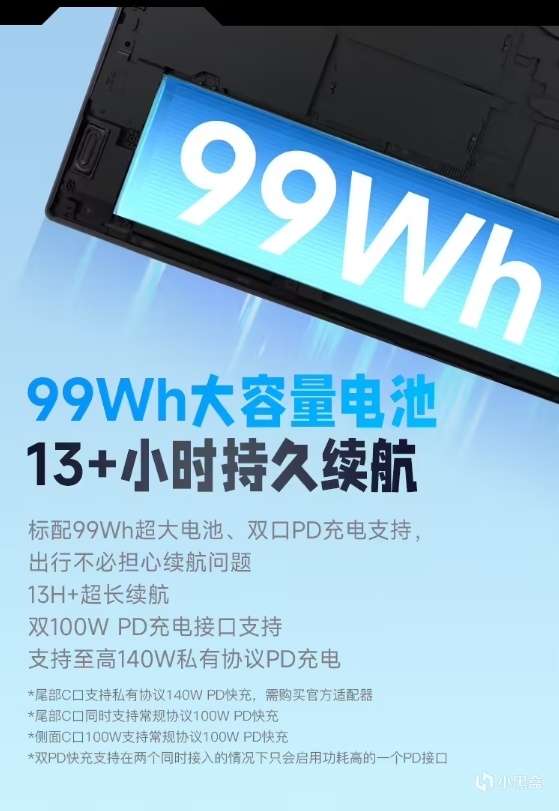 ① 内置 99Wh 大容量电池,标称可满足 13 小时以上的日常使用需求;