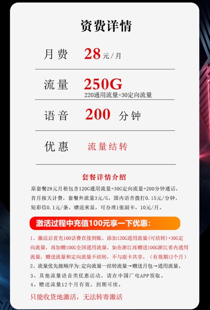 资费28元,250g流量(220g全国通用流量+30g定向流量)+200分钟通话。这是广电现目前最划算的流量卡,唯一的缺点就是地区限制多,不发货的省份有点多。
