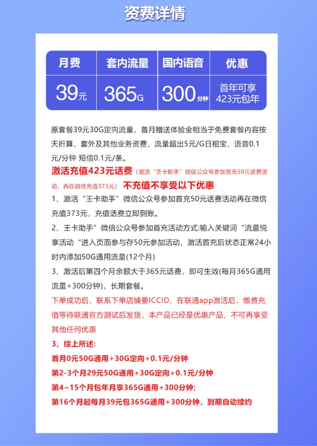 资费39元,365g全国通用流量+300分钟通话。这是联通现目前流量最大的卡,缺点也很明显:首充要求太高,激活时必须首充50+373,即423元。而且要求是先激活充值,等联通官方测试,确定能够开通优惠叠加之后才发货。(测试不通过会退费)。