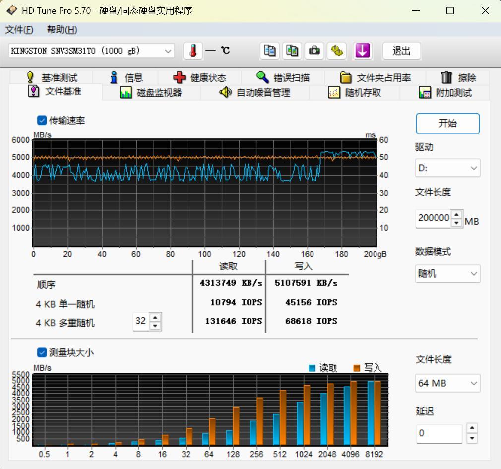 HD TUNE的文件基准测试,将写入样本设定为200G,读写速度如下。