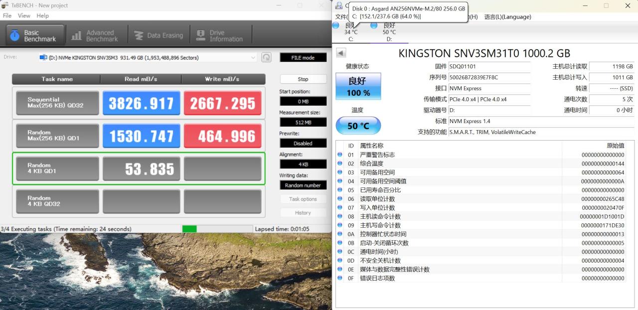 TXBench测试进行到50%进度时,读取固态硬盘的温度值,为50度,还算不错。