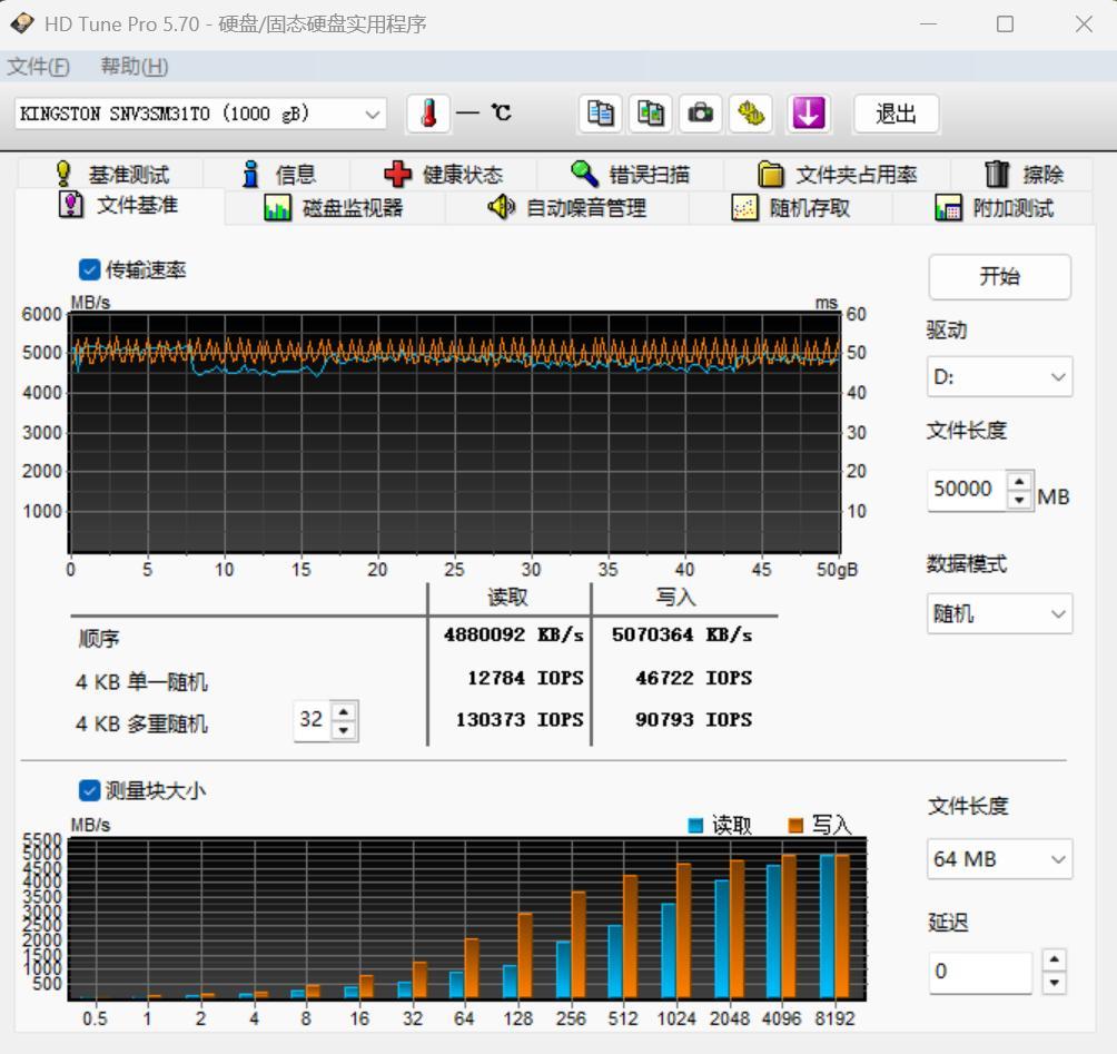 HD TUNE的文件基准测试,将写入样本设定为50G,读写速度如下。