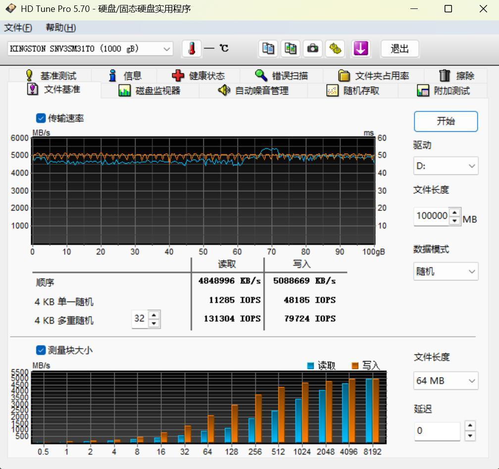 HD TUNE的文件基准测试,将写入样本设定为100G,读写速度如下。