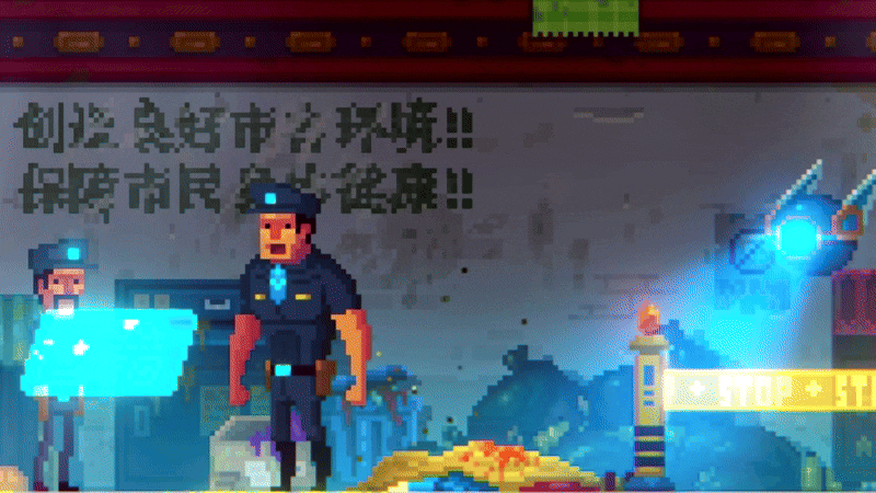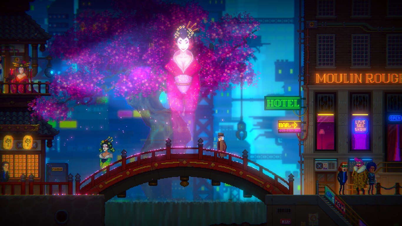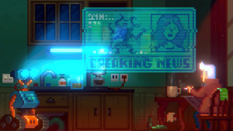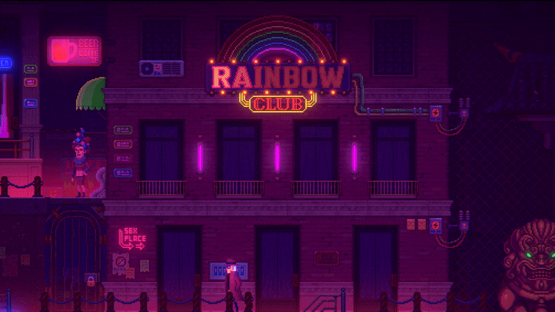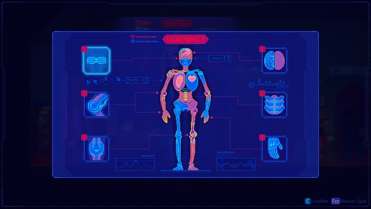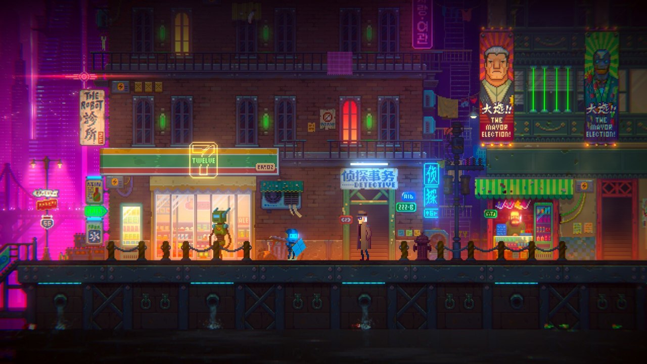 值得一誇的是,遊戲的像素畫面挺精緻的,整體觀感統一,畫面偏向復古可愛,遊戲場景內的點光源設置十分到位,在模擬賽博朋克市井風上比較出色