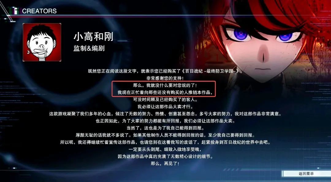 距離《百日戰紀-最終防衛學園-》(以下簡稱《百日戰紀》)發售已經過去了70多天,但其製作人小高和剛依舊活躍在中文社交網站上,賣力地給自己的作品帶貨。他身上由此而來的熱度,也同樣尚未退卻。
